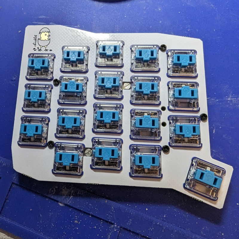 Insert Choc switches into each position on the switchplate. The orientation varies, so pay close attention.