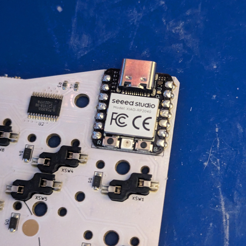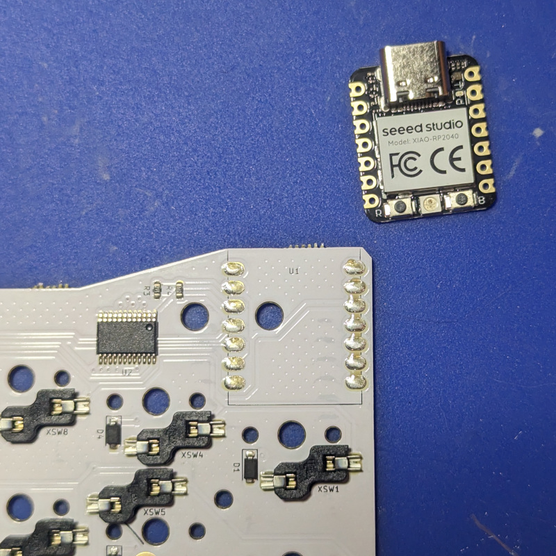 Attach the Xiao to the pads on the back of the left-hand side of the board using your preferred method (i.e., both reflow and iron soldering work well).