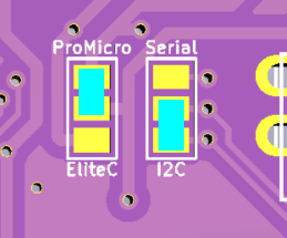 - Solder the two jumpers to select serial/I2C and Elite-C/Pro Micro.